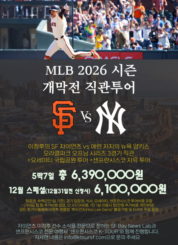 샌프란시스코 자이언츠 이정후 선수의 2026년도 개막전 직관투어를 자이언츠 이정후 선수 전담 취재 언론사인 SF Bay News Lab과 샌프란시스코 전문 여행사 ‘샌프란시스코 K-투어’가 함께 진행합니다.
